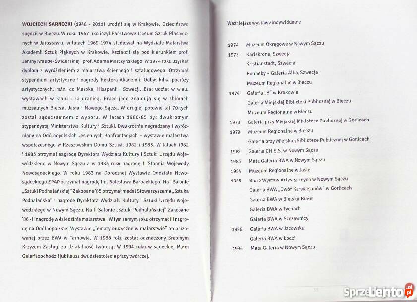 W ofercie : Abstrakcja,olej,dykta;54 x 64 cm,sygn.p.d.: W.SARNECKI/2004, Studiował na Wydziale Malarstwa Akademii Sztuk Pięknych w Krakowie. Kształcił się pod kierunkiem prof. Janiny Kraupe-Świderskiej i prof. Adama Marczyńskiego, w pracowni, którego w 1974 roku uzyskał dyplom. W ostatnich latach żył i tworzył w odosobnieniu. Z obrazów artysty, który zawsze wychodził - jak sam mówił - od natury można odczytać stany uczuciowe i niepokoje ich autora, przejawiające się w dynamicznym, udramatyzowanym rysunku. Po częściowej utracie wzroku zmienił się u artysty sposób widzenia rzeczywistości, poprzez płaskie postrzeganie świata, malarz skupił się na przestrzeni czysto malarskiej ukształtowanej poprzez układ form i kolorów. W prezentowanej pracy można dostrzec wszystkie cechy dojrzałego malarstwa Wojciecha Sarneckiego (1948-2011).Sprawdź zainteresowanie tym ogłoszeniem