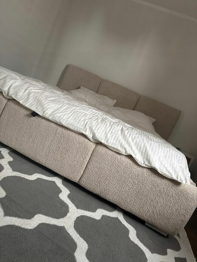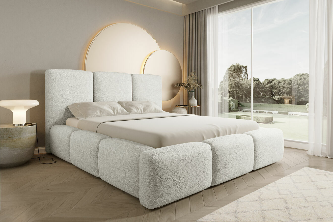 Przyjemna Tkanina Typu Bouclé puszysta – idealne do łóżka, które ma być nie tylko funkcjonalne, ale też relaksujące. Obicie sprawia, że zagłówek staje się wygodnym oparciem do czytania, oglądania czy pracy z laptopem. Catch me to materiał o charakterystycznej, pętelkowej strukturze, który nadaje meblom teksturalny, ale jednocześnie subtelny wygląd.