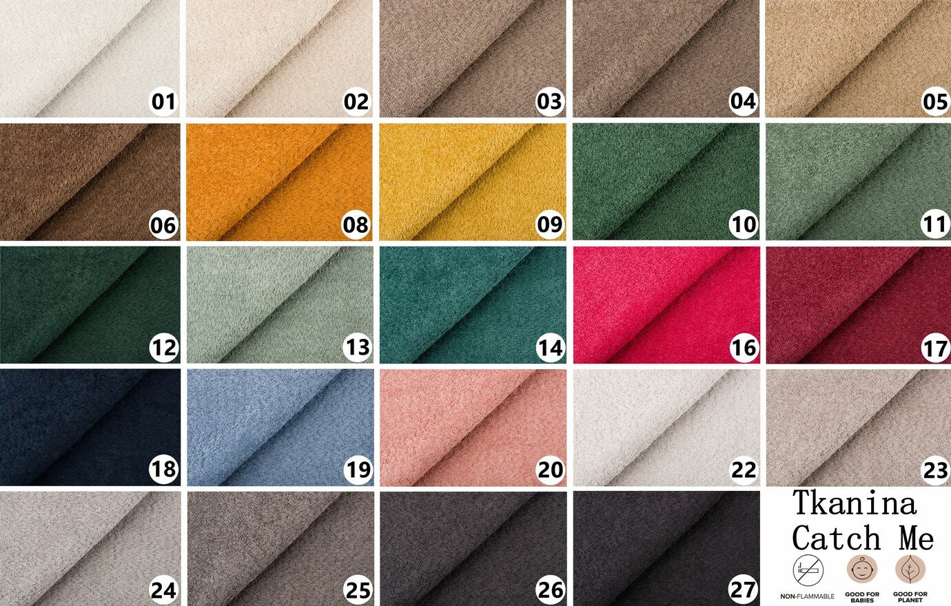Przyjemna Tkanina Typu Bouclé puszysta – idealne do łóżka, które ma być nie tylko funkcjonalne, ale też relaksujące. Obicie sprawia, że zagłówek staje się wygodnym oparciem do czytania, oglądania czy pracy z laptopem. Catch me to materiał o charakterystycznej, pętelkowej strukturze, który nadaje meblom teksturalny, ale jednocześnie subtelny wygląd.