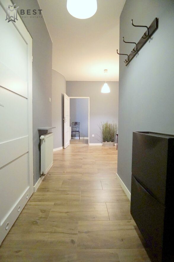 Mieszkanie umeblowane, składa się z 3 niezależnych pokoi, kuchni (duża lodówka, kuchenka elektryczna z piekarnikiem,okap,zmywarka), łazienki z wc (pralka) oraz przedpokoju (szafy,stojak na obuwie,wieszak).