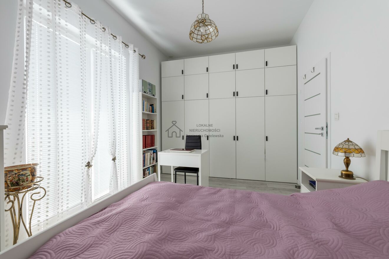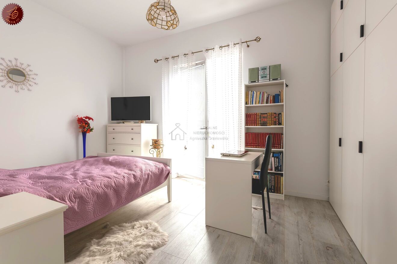 wygodna sypialnia z wyjściem na balkon, dużą szafą w zabudowie i biurkiem do pracy,