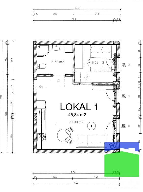 Lokal nr 1 - 45,84 m2 (2 pok.) - lokal wykończony "pod klucz"