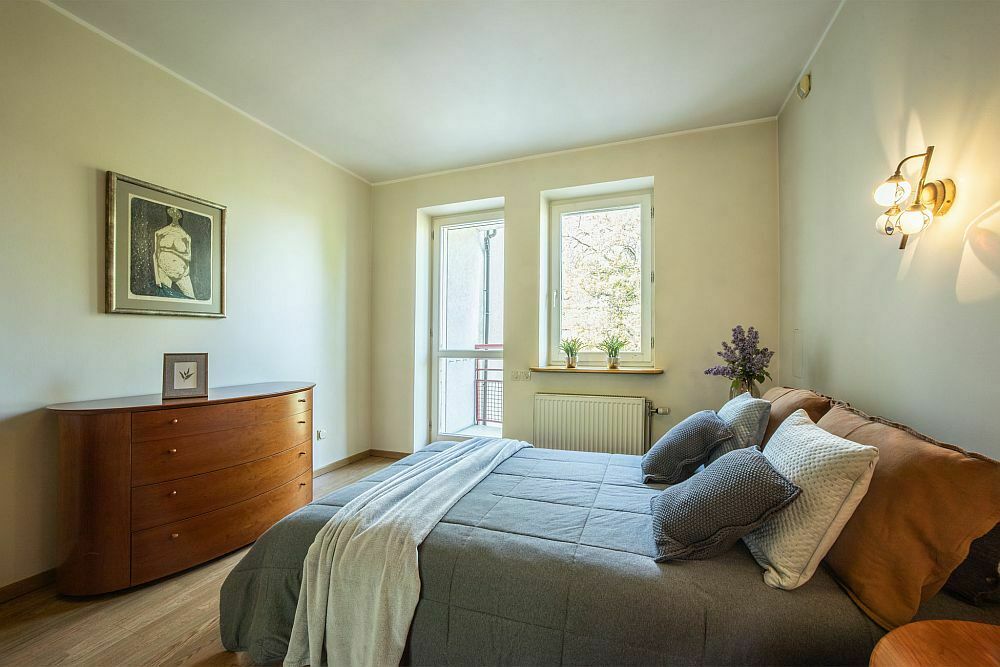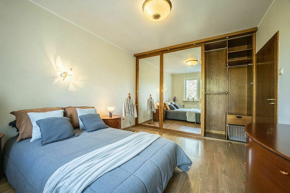 - Sypialnia główna (ok. 15 m²): z wyjściem na balkon, wyposażona w pojemną szafę wnękową wykonaną z litego drewna (dąb) z ozdobnym, kryształowym lustrem.