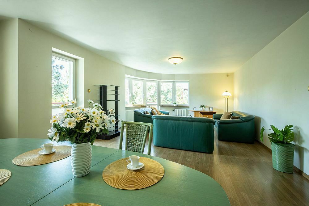 - Salon (ok. 40 m²): przestronny, jasny, z dwoma niezależnymi wyjściami na balkony od strony południowej. Dzięki dużym przeszkleniom i południowej ekspozycji wnętrze jest idealnie doświetlone przez cały dzień. Pomieszczenie pozwala na swobodną aranżację strefy wypoczynkowej i jadalnianej.