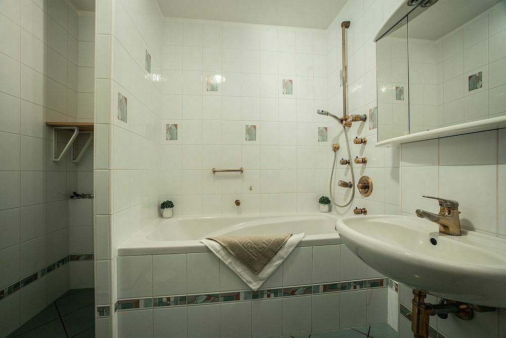 - Łazienka: przestronna, z wanną, deszczownicą oraz miejscem na pralkę i półkami do przechowywania.