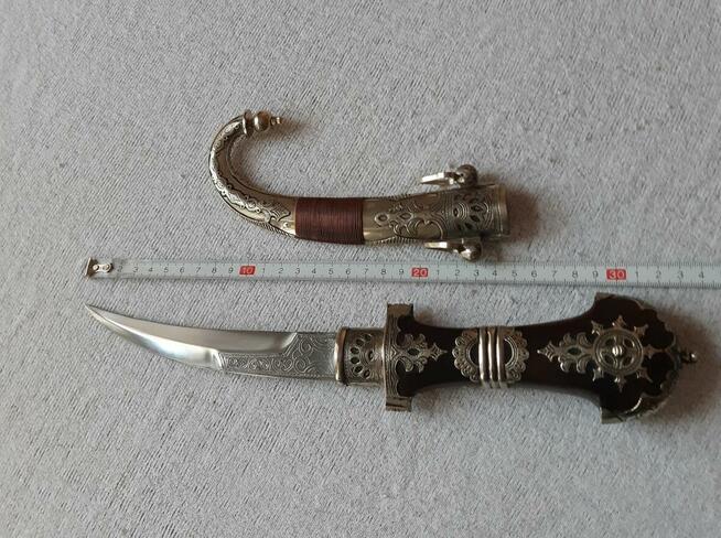Orientalny sztylet z pochwą, Nie replika orginalnerę ,kojeść z egzotycznego woodna bogato zbodionami metalowymi ...